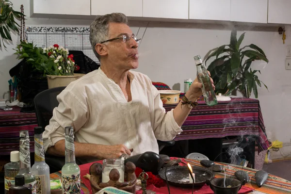 The sound Beery makes next is a bit like my five-year-old daughter’s imitation of an elephant. And then, after a few beats, the expelled spume of atomized rum descends in a cool mist across my face, passing over me like a spirit. There follows a change of temperature, if not a change of state; the cooling effect dissipates almost at once. Beery would call it “energy cleansing,” and might use it, along with smoke and flame, in the customary limpia cleansing ceremony that begins one of his shamanic sessions.